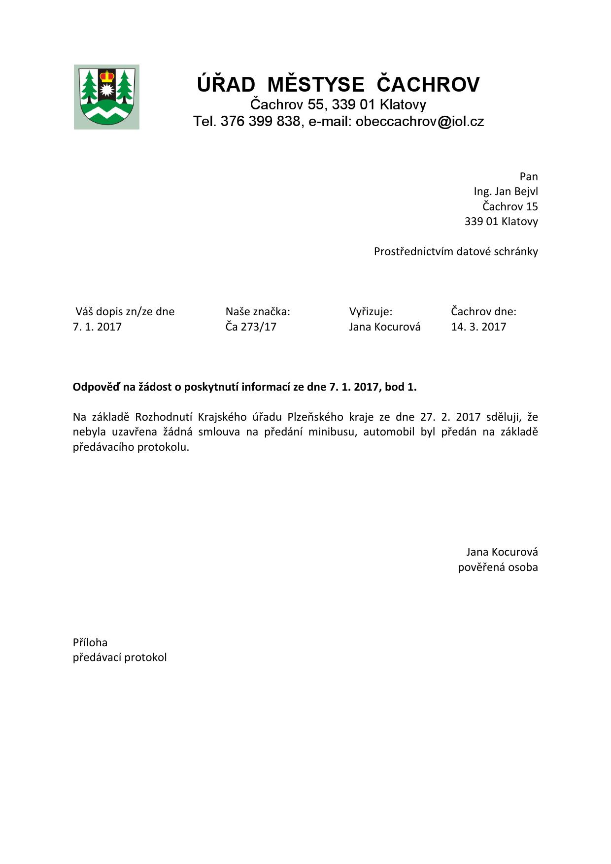 Jak už jste asi zaznamenali, na úřední desce městyse byla zveřejněna žádost o poskytnutí informace (ze 7. 1. 2017) ohledně obecního autobusu. Podivné nakládání s tímto vozidlem jsem již zmínil v komentáři k zasedání ZM ze dne 8. 12. 2016, viz. zde.