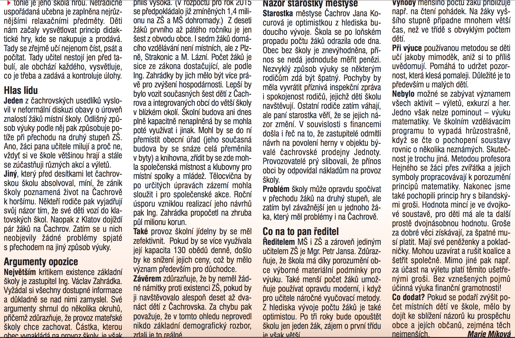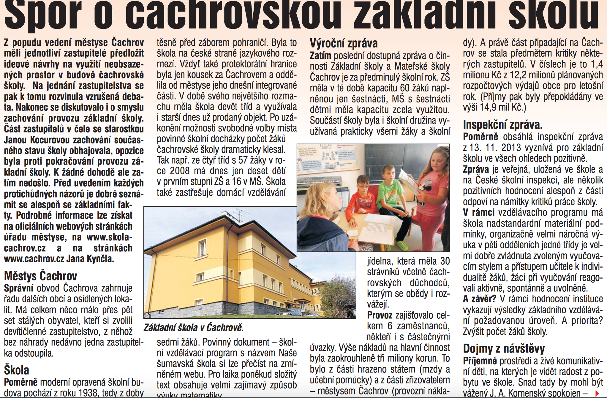 V desátém čísle měsíčníku Rozhled lze nalézt článek s názvem „Spor o čachrovskou základní školu“. Po jeho přečtení se nabízí otázka, co že tím chtěla autorka říci. Vždyť přece sporů o něco nalezneme na každém zastupitelstvu zdejšího regionu mnoho. Toto téma totiž není z těch, které by upoutalo pozornost pisatelky svou zajímavostí, či vážností obsahu. Zde se jedná o pouhou práci na zakázku, což samozřejmě vysvětluje mnohé další. Nelze však říci, že by se autorka nesnažila o objektivnost, avšak její míra je limitována jasnými pohnutkami zadavatele.