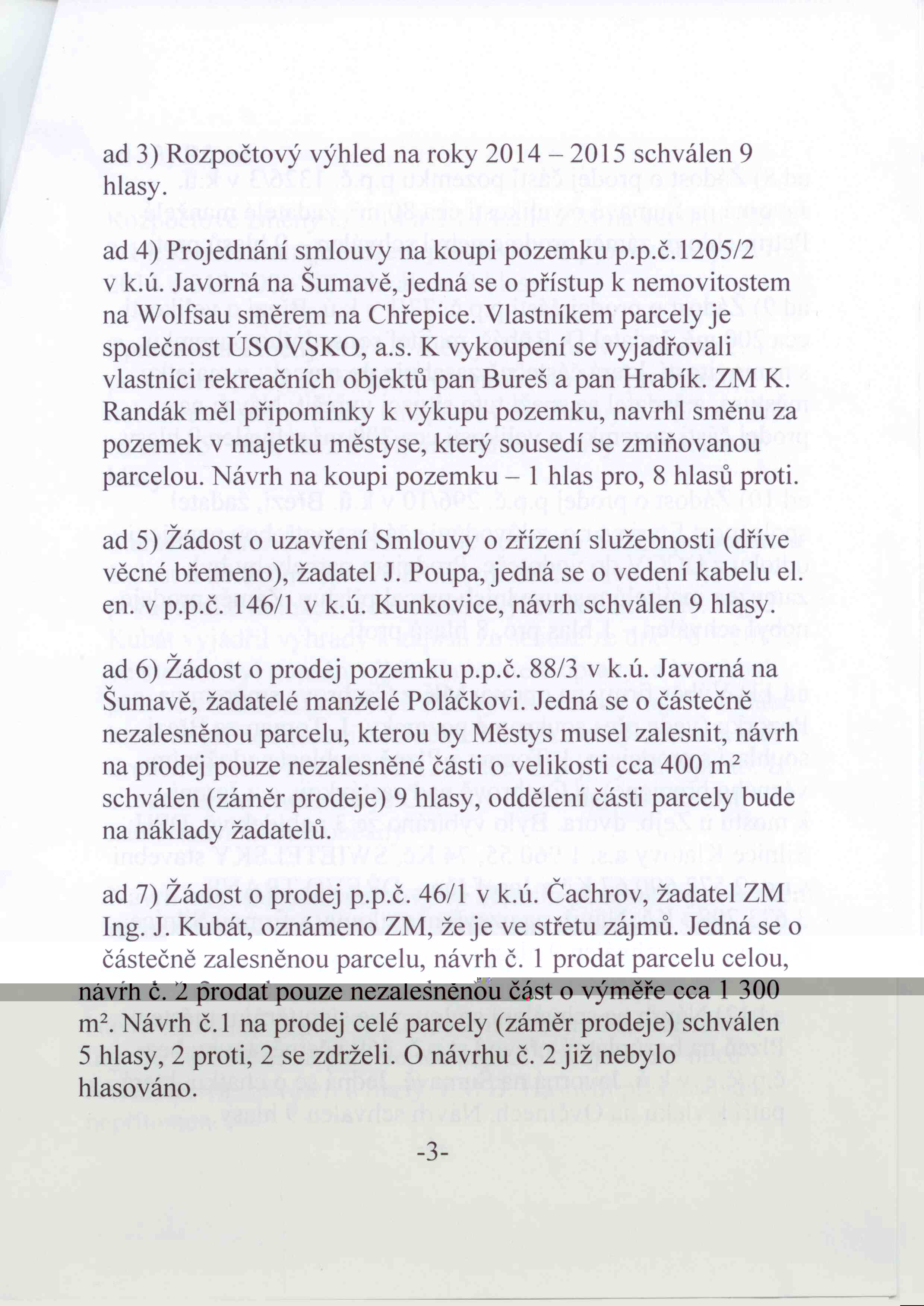 V programu schůze zastupitelstva na 28.8.2014 se to opět hemží prodejem pozemků a jestli se Jendo ptáš jaký je zájem obce tak věz, že žádný. U již výše zmíněného lesního pozemku č. 46/2 jde nejspíš o "poděkování". Když se totiž podíváš do vlákna zde http://www.mestyscachrov.cz/forum/viewt ... p?f=5&t=16 zjistíš, že jeden opoziční zastupitel v tomto hlasování "přeběhl". A shodou nevysvětlitelných náhod zrovna tenhle kluk dostává lesní pozemek nezanedbatelné výměry, který by hned tak někdo nezískal. Celkem snadné počty. 8-) Přes další prodávaný pozemek vede cesta (krom jiného) turistická cesta atd. atd. Obecný zájem musí zkrátka ustoupit zájmu jednotlivců. Obávám se ale, že tím příběh nekončí a že v souvislosti s nacházejícími volbami se ještě nějakého přeběhlictví a prodejů obecních pozemků dočkáme. "Děkovat" a kupovat si hlasy je totiž třeba. Všechno zlé je ale k něčemu dobré a tak se alespoň dozvíme jakou má kdo cenu. ;)
