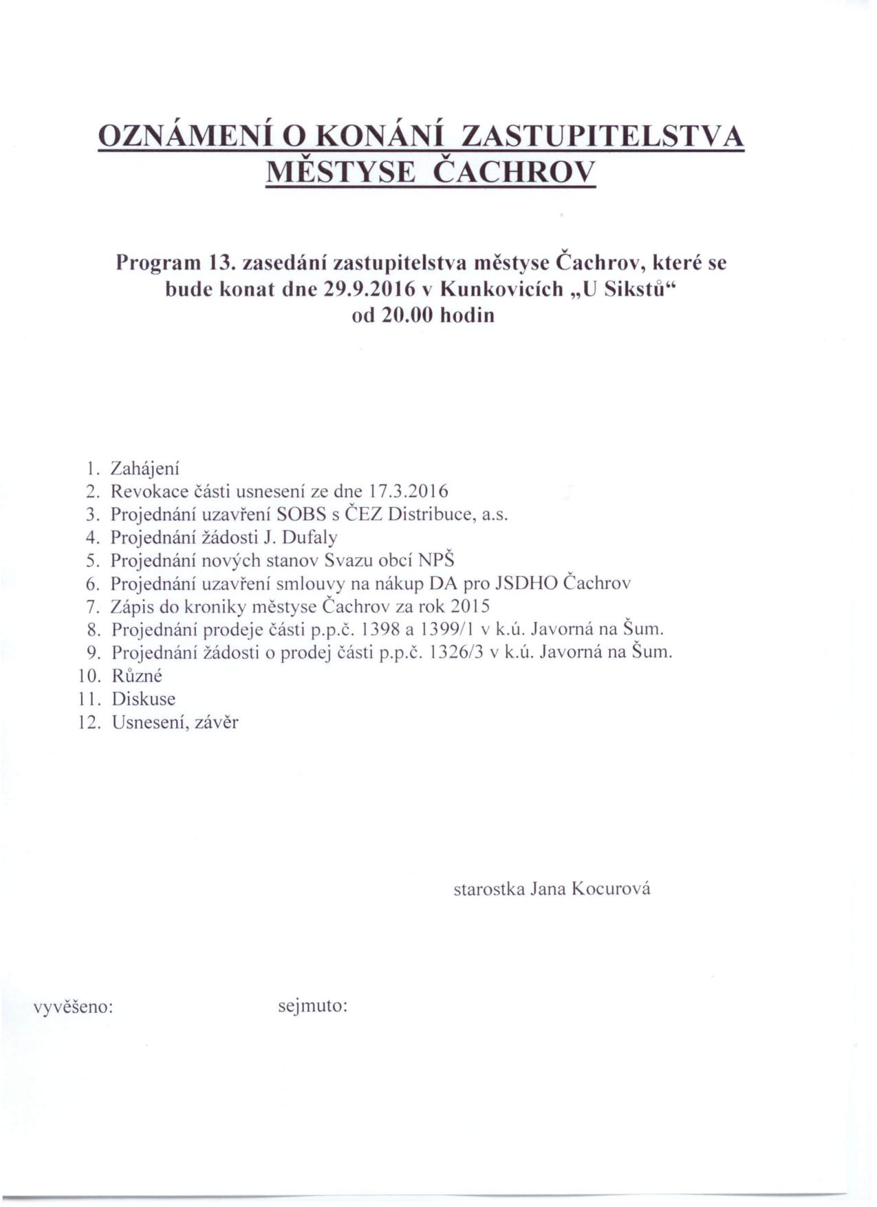 Zde je oficiální oznámení konání zasedání ZM. Hned v samotném úvodu se ujal slova p. Randák, který oznámil, že se vzhledem k zdravotnímu stavu nedostaví starostka. Až potud vše ok. Jenže pokračoval informací, že se zasedání ZM tímto ruší. A tak se na Čachrově zrodil nový úkaz, kdy řadový zastupitel ruší řádně svolané a usnášeníschopné zasedání zastupitelstva. Usnášeníschopnost je totiž jediná podmínka, kterou zákon vyžaduje k tomu, aby řádné svolané zasedání zastupitelstva mohlo proběhnout.O nepřítomnosti či nemoci starosty a dalších fabulacích, kterými se zdejší herci oháněli není v zákoně o obecním zřízení ani zmínka. Posuďte sami...